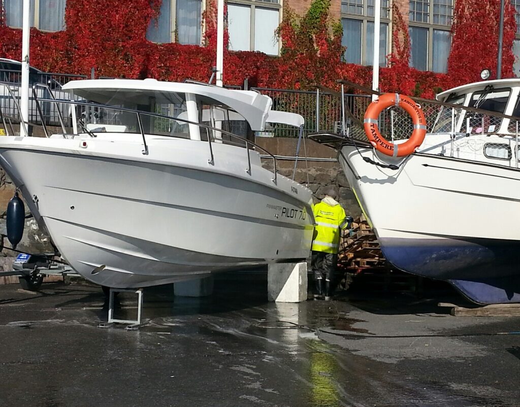 Painepesuria käytettäessä on aina parempi aloittaa matalalla paineella ja testata ensin huomaamattomaan kohtaan veneessä. Näin voit varmistaa, ettei pinta vahingoitu käsittelyssä.