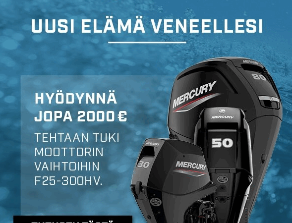 MOOTTORINVAIHTO KAMPANJA – Uusi elämä vanhalle veneellesi! Hyödynnä nyt huikeat kampanjaedut Mercury -perämoottoreille 25-300hv. Tehtaan tuki myönnetään valtuutetulla jälleenmyyjällä 20.6.2025…